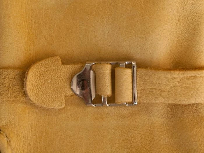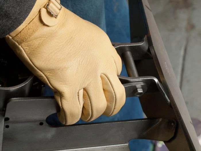 The medium weight deerskin gloves in Tan, provide the dexterity of driving gloves, and the durability of a genuine work glove. The metal slide buckle, is a nice detail, and for us really seals the deal on this work-a-day hero.