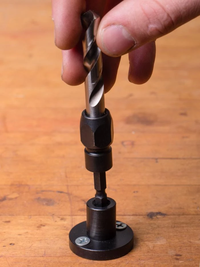The hex socket fits on the 1/4″ bit shank, providing more meat to wrench on when you’re loosening a collet to change out the drill bit while protecting the shank.