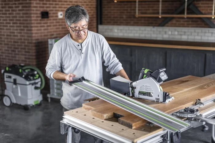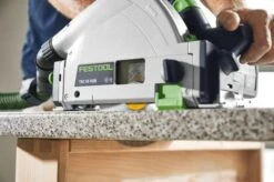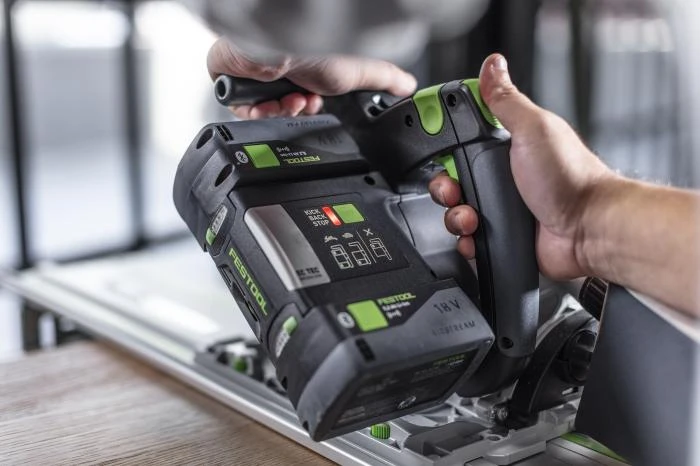 The TSC has also been improved in other ways. The new model allows you to make powerful, precise cuts at up to twice the speed with an extended battery range. The brushless EC-TEC motor, combined with 2 lithium-ion batteries, possess maximum cutting power despite being off the power cord. The saw uses a new generation of thinner-kerf saw blades that have a strikingly long life and give splinter free, laser straight cuts every single use. Dual splinter guards ensure zero tear cuts no matter what the material. Although nothing compares to working in tandem with a world-class Festool dust extractor, a Festool dust collection offers a credibly low-dust mobile working option.