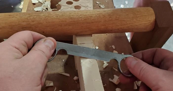When you harden steel it typically warps a little. After hardening our drawknife usually has a very slight concavity on the bottom. This is intentional and it helps sharpening the tool.