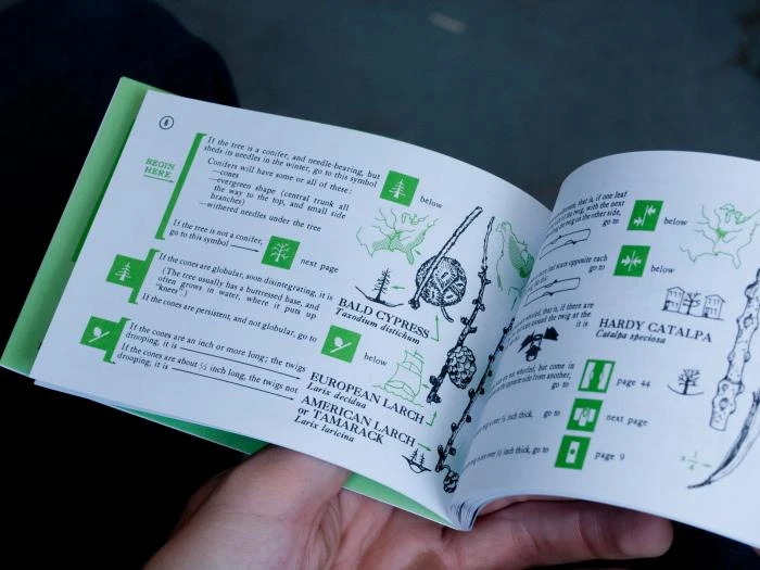 Despite the technical nature of the Pocket Finders, the books have a human touch, and humor that goes beyond the old-fashioned layout, and hand inked illustrations. In my mind the spirit of the pocket finders is encapsulated by a pair of illustrations and captions in the Winter Tree finder. On the lower half of page five, my Grandmother and Grandfather’s initials appear carved into the smooth bark of a tree surrounded by a heart. The illustration and caption to the right, of a cookie cutter housing tract, strikes a different tone, typical of my Grandfather’s dry humor: