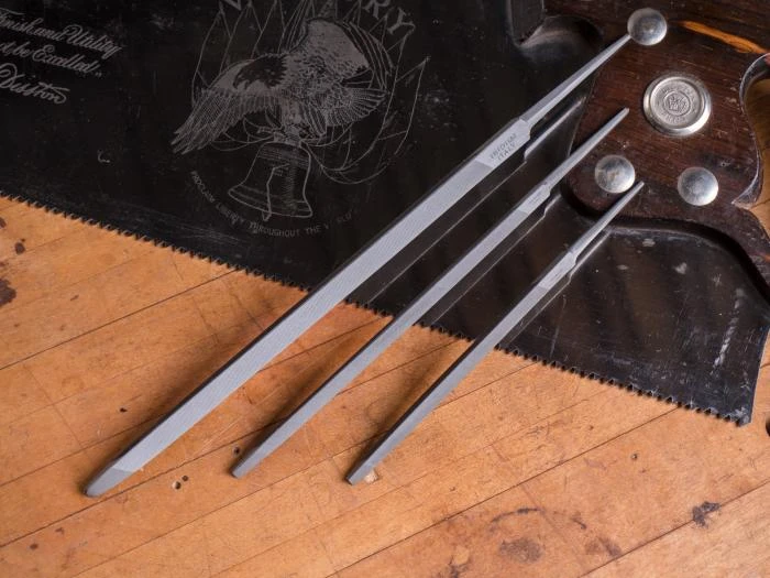 We have found that for larger backsaws and our hardware store saw a 3-square machinists file produces the best result. 3-square files have the smallest arrises, and being second cut, cut finer and better on thin plate saws. The narrow arrises mean deeper gullets and faster sawing.