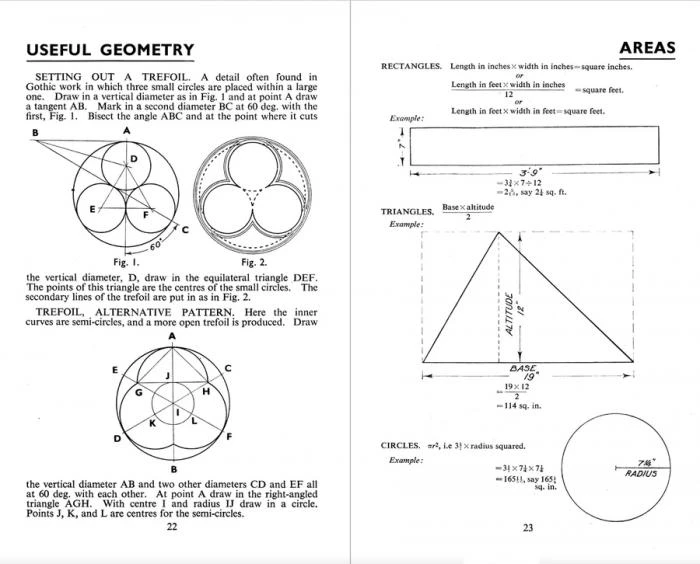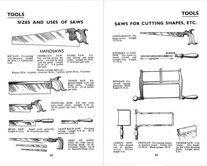 Hayward published the book in the late 1940s as a handy compendium and has been republished in different editions. This book is a reprint of the original edition. The range of topics Hayward thought would be useful to have on hand is impressive — everything from recipes for French polish and other finishes to tips to cleaning oil stones; understanding timber terms; useful geometry for woodworking; choosing the correct screw or nail; and converting millimeters to inches.