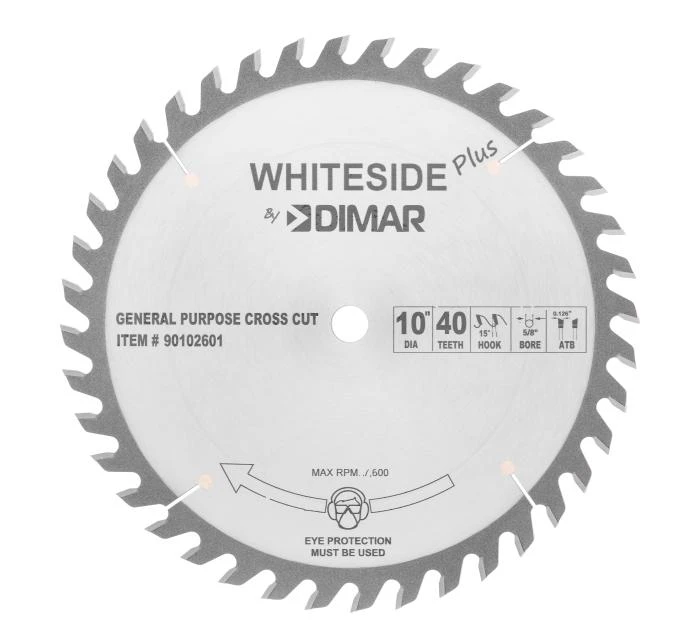 The blades can be used for ripping, crosscutting, trimming, and sizing. The moderate hook angle provides a good balance between feed and surface quality along with extended blade life. The tooth geometry is Alternate Top Bevel (ATB), which means every other tooth is beveled on the top in the opposite direction of the adjacent teeth (also known as alternating between a right- and left-hand bevel). This gives a nice smooth cut in woods and veneered plywood with little or no tear-out and easy chip removal.